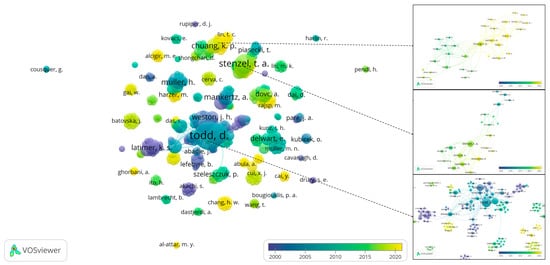 Visualized in Figure 4 is the collaboration map among authors who worked on PiCV-related research. In total, 455 individuals were identified to have authored or co-authored the retrieved records included in the current review. In general, as observed in institutional collaboration mapping above, clusters of collaborations were identified among authors. Most notable among which is the extensive collaboration cluster of Todd, Daniel of the Agri-Food and Bioscience Institute of the Department of Agriculture, Environment and Rural Affairs (DAERA), which succeeded the Department of Agriculture and Rural Development for Northern Ireland, shown above to have the most number of institutional links (Figure 3b). Previously working on other viruses with circular genomes, particularly chicken anemia virus, psittacine beak and feather disease virus, and porcine circovirus, Todd’s first publication released in 2000 is also the most cited record retrieved in this review [42] based on the data gathered from the Dimensions database. Detailed in Table 2 are the top authors ranked by the number of retrieved records, with their respective citations, total link strength, and year of last publication.