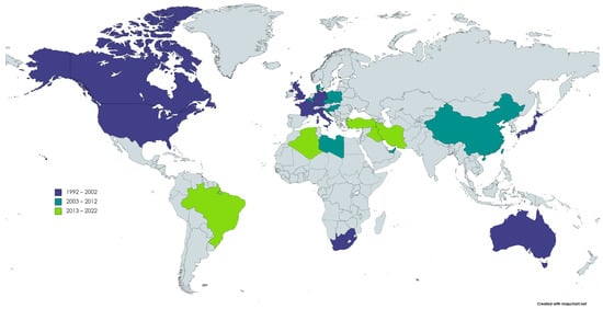 On the other hand, several records were also observed to have been produced, or co-produced from countries that have not had outside collaborations (Figure 3b). Among these countries are Netherlands [37], Japan [21,38], Iraq [39], Czech Republic [29,32], and Brazil [40].