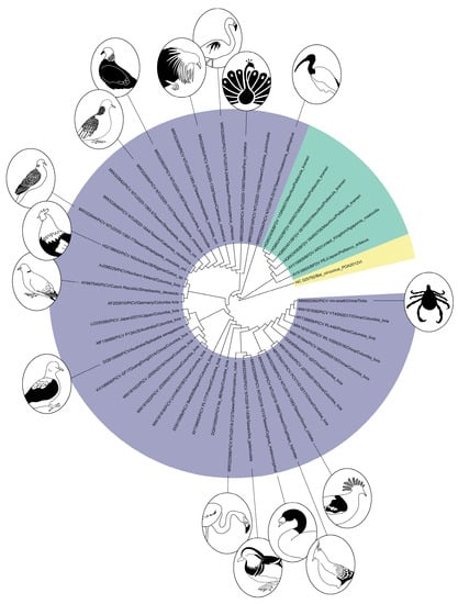 - Kong, Y.; Yan, C.; Zhang, G.; Cai, Y.; He, B.; Li, Y. Detection of pigeon circoviruses in ticks of sheep and camels in Inner Mongolia, China. bioRxiv 2021. [Google Scholar] [CrossRef]