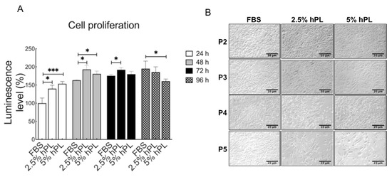 Cell proliferation analysis and morphology observation in GBM cells cultured with FBS and hPL mediums. (A) Cell-Titer Glo assay was investigated in GBM cells maintained in FBS, 2.5% and 5% hPL mediums for 24 h–96 h. Data are mean ± SD of five independent experiments. Student’s t-test, *, p < 0.05, ***, p < 0.001. (B) The morphology of GBM cells cultivated from passage 2 to passage 5 with FBS, 2.5% and 5% hPL culture mediums. GBM cells were subcultured every 4 days under serum or serum substitute culture mediums, and subcultivation ratio of 1:4 was determined. Scale bar = 20 μm.