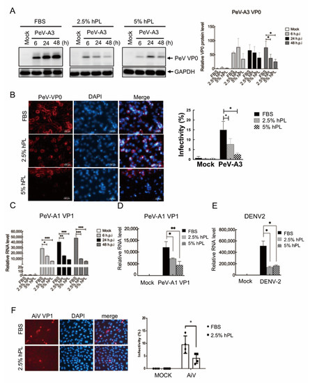 To confirm the hPL-mediated inhibition of virus replication, additional virus infections were conducted. GBM cells were infected with PeV-A1 or dengue virus type 2 (DENV-2) at MOI = 1, and the viral gene replication was measured. Results showed significant inhibition of viral replication in GBM cells with 2.5% and 5% hPL-supplemented growth mediums (Figure 2D,E). Moreover, another picornavirus, AiV [34], which causes gastroenteritis, was used in the analysis. The immunofluorescence assay of AiV infection was conducted. Compared with FBS medium-maintained A549 cells, hPL-cultured A549 cells had lower infectivity of AiV (Figure 2F). These results indicated an unrevealed antiviral activity of hPL.