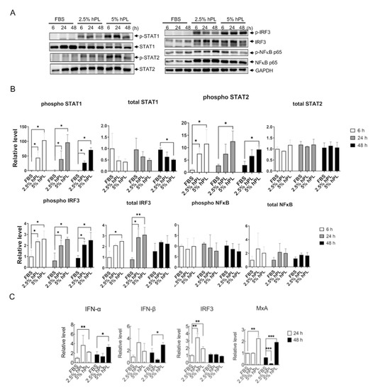 hPL contains abundant growth factors and cytokines [7,8,9]. The hPL-mediated virus reduction may be attributed to the activation of cellular antiviral responses in GBM cells cultured with hPL-supplemented growth medium. In particular, it would be important to elucidate whether IFN antiviral response was correlated with the hPL-mediated restriction of viral replication [35]. Type I IFN-signaling pathway was analyzed by determining the activation of STAT1/2, IRF3 and NFκB p65 in GBM cells cultured with FBS- or hPL-supplemented medium for 6 h, 24 h, and 48 h. Immunoblotting assay results showed activation of type I IFN-signaling proteins of phospho-STAT1, phospho-STAT2, and phospho-IRF3 in GBM cells cultivated in 2.5% and 5% hPL- supplemented medium compared with FBS-supplemented medium (Figure 3A, left panels); the total protein amount of IRF3 and NFκB p65 were increased in hPL-cultured GBM cells (Figure 3A, right panels). The protein level was also quantified and statistically analyzed. Compared with FBS, hPL significantly increased the level of phospho-STAT1, phospho-STAT2, phospho-IRF3, and total IRF3 (Figure 3B). Moreover, significant induction of gene expression of IFN-α, IFN-β, IRF3, and MxA was detected in GBM cells with a 5% hPL-supplemented medium (Figure 3C). These data suggested that activation of cellular antiviral response in GBM cells incubated with hPL might contribute to virus restriction.