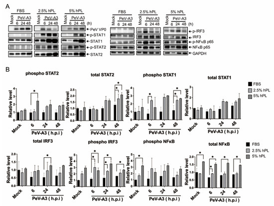 hPL-supplemented growth medium-induced expression of IFN-signaling pathway under PeV-A3 infection of GBM cells. (A) GBM cells were infected with PeV-A3 at MOI = 1 for 6 h, 24 h, and 48 h under FBS- or hPL-supplemented growth mediums. Cellular protein lysates were extracted to analyze IFN-signaling pathway by immunoblotting using anti-PeV VP0, anti-phospho-STAT1, anti-total STAT1, anti-phospho-STAT2, anti-total STAT2, anti-phospho-IRF3, anti-total IRF3, anti-phospho-NFκB, anti-total NFκB p65, and anti-GAPDH. (B) Quantification of different protein expressions was normalized to GAPDH. Data are mean ± SD of three independent samples. Student’s t-test, *, p < 0.05 compared with FBS.