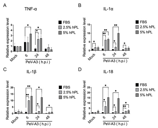 (A–D) hPL-supplemented growth medium-induced inflammatory cytokines under PeV-A3 infection of GBM cells. Inflammatory cytokines IL-1α, IL-1β, IL18, and TNF-α were analyzed using real-time qPCR. Data are mean ± SD of three independent samples. Student’s t-test, *, p < 0.05; **, p < 0.01 compared with FBS.