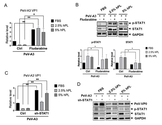We demonstrated that fludarabine effectively increased viral replication during PeV-A3 infection. STAT1 inhibitor, Fludarabine, -treated FBS- and hPL-cultured GBM cells showed reduced levels of phospho-STAT1 and elevated levels of STAT1 protein under PeV-A3 infection; similar results were detected in STAT1 knockdown cells (Figure 6). Taken together, these results confirmed that hPL inhibits viral infection by activation of the cellular antiviral STAT1 pathway. Another study showed that fludarabine inhibits enterovirus type 71 (EV-71), SFTS Phlebovirus, and ZIKA virus infection in human astrocytes and human microglia cells [50]; however, the antiviral mechanism was not investigated. Whether fludarabine protects or destroys infected neuronal cells should be further investigated and verified in animal models.