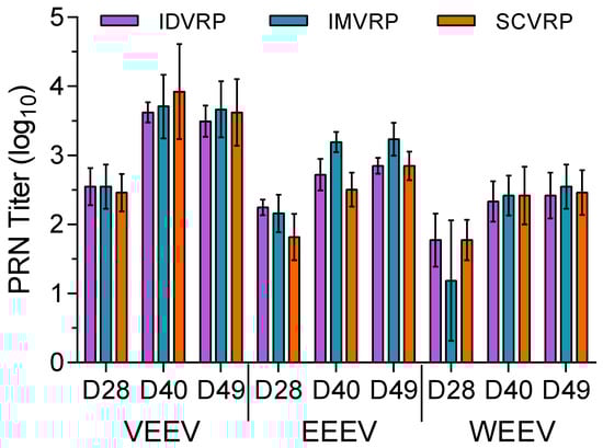 Animals were randomized into five groups consisting of either six or seven animals each. Three groups of seven animals each were vaccinated via the intradermal (ID), intramuscular (IM), or subcutaneous (SC) route with the WEVEE VRP vaccine (3.0 × 109 infectious units (IU) total; 1.0 × 109 IU each VEEV, EEEV, and WEEV VRPs). Two groups of six animals each received a placebo (phosphate buffered saline; PBS) ID or IM. A second round of vaccinations or placebo was given 28 days later. On days 28, 40, and 49 after primary vaccination, blood was collected to measure virus-specific neutralizing antibody responses.
