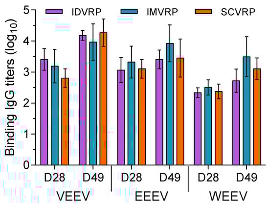 Twenty-one cynomolgus macaques (three groups, n = 7 NHP/group) received WEVEE VRP intramuscularly (IM), intradermally (ID), or subcutaneously (SC). Twelve cynomolgus macaques (two control groups, n = 6 NHP/group) received PBS IM or ID. Whole blood was collected from NHPs and serum was isolated to assess the levels of binding and neutralizing antibodies present. Neutralizing antibody titers were measured by PRNT assay on sera collected prior to and on days 28, 40, and 49 after primary vaccination. Total binding IgG levels were measured by ELISA using sera collected prior to and on days 28 and 49 after primary vaccination. All pre-vaccination PRNT and ELISA levels were negative (<1:20) for all animals and all PBS-inoculated controls animals remained negative through day 49. Based on PRNT assay results, WEVEE VRP vaccination resulted in the production of VEEV, EEEV, and WEEV neutralizing antibody responses that were enhanced by homologous boost vaccination on day 28 after primary vaccination (Figure 1). Comparable levels of neutralizing antibody responses were stimulated when NHPs were vaccinated ID, IM, or SC. Peak neutralizing titers were reached by day 40 after primary vaccination and neutralizing titer levels were largely sustained through day 49. Based on ELISA, WEVEE VRP vaccination resulted in the production of VEEV, EEEV, and WEEV binding antibody responses that were enhanced by homologous boost vaccination on day 28 after primary vaccination (Figure 2). Comparable levels of binding antibodies were stimulated when NHPs were vaccinated ID, IM, or SC.