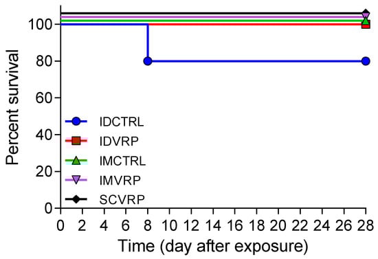 One ID-control NHP, ID CTRL-1, met euthanasia criteria on day 8 PE with a clinical score of 20 and was humanely euthanized. A second ID-control NHP, ID CTRL-6, was removed from study due to complications and loss of a functional telemetry device. This NHP was not included in any additional analyses reported. All IM-control and all WEVEE VRP-vaccinated NHPs survived to study end-point (Figure 3). Examining IM- (n = 6) and ID- (n = 5) control animals together, WEEV aerosol challenge resulted in 9% mortality overall. There were no statistically significant differences in survival rates between the WEVEE VRP-vaccinated NHPs and the control NHPs.