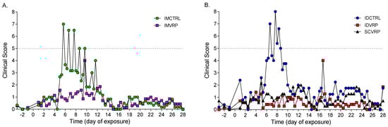 Average clinical scores. (A) IM-control and IM WEVEE VRP-NHPs (n = 6, and 7 respectively). (B) ID-control, ID WEVEE-VRP, and SC WEVEE VRP-NHPs (n = 5, 7, and 7 respectively).