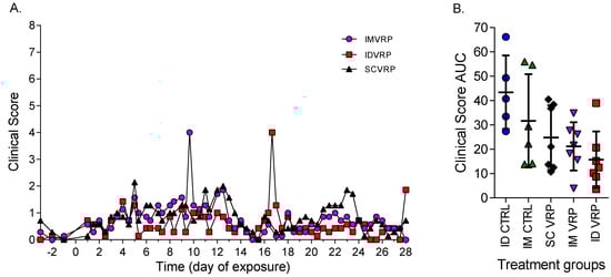 Clinical scores of WEVEE VRP-vaccinated NHPs. (A) Average clinical scores for ID, IM, and SC VRP-vaccinated NHPs (n = 7/group). All vaccinated NHPs survived to study end-point. The peak for the IM group on day 9 post exposure (PE) and the ID group on day 15 PE are due to one NHP with a score of 6 at each time point. (B) Area under the curves for each NHP per treatment group. Dots represent individual animals; bars represent the mean; error bars represent ± standard deviation.