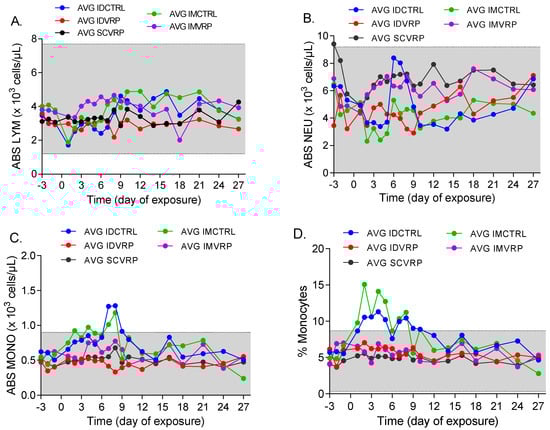 Hematology changes in NHPs following WEEV CBA87 exposure. Blood samples were collected on days −3 thru −1 before exposure and days 1 thru 10, 12, 14, 18, 21, 24, and 27/28 post exposure (PE) for all NHPs, except for ID CTRL-1, which was sampled at the prescribed schedule until time of euthanasia on day 8 PE. The average absolute lymphocyte (A), absolute neutrophil (B), absolute monocyte (C), and percent monocyte (D) are graphed for the control and VRP-vaccinated groups. Gray shaded areas indicate normal range for each analyte.