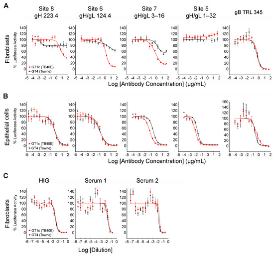 The neutralizing activity of HIG or sera from CMV-infected individuals is the aggregate result from antibodies targeting a broad range of neutralizing epitopes in several viral envelope glycoprotein complexes. However, antibodies to gB dominate the neutralizing activity affecting fibroblast entry [47,48,49] while antibodies to the PC dominate the activity affecting epithelial cell entry [27,50]. Although the inhibitory effects of gO are likely to be restricted to a limited number of epitopes within gH/gL, the type of gO could have an influence if a significant portion of the neutralizing activity induced by natural infection is attributable to antibodies targeting these gH/gL epitopes. Thus, to determine if gO type alters the neutralizing potency of polyclonal antibody mixtures induced by natural CMV infection, GT1c and GT4 were again used in fibroblast-based assays to evaluate the neutralizing activities of HIG, as well as sera from two individual CMV-seropositive donors. For all three samples, the neutralization curves generated with GT1c and GT4 were superimposable (Figure 3C), indicating that any influence of Towne gO on inhibiting the activity of antibodies specific to gH/gL epitopes is not sufficient to perturb the net neutralizing effects of these complex polyclonal antibody mixtures.