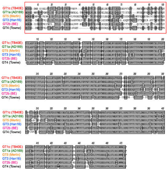 Polymorphisms of gO amino acid sequences encoded by diverse CMV strains. Predicted gO amino acid sequences from CMV strains TB40/E, AD169, Merlin, Han16, BE/29/2011, and Towne were aligned using clustalW. Numbers refer to amino acid positions in Merlin gO; the red box indicates the most highly polymorphic region.