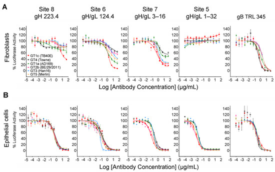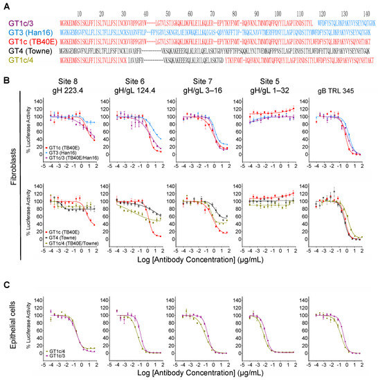 As illustrated in Figure 4, CMV gO exhibits significant strain polymorphism, particularly in the N-terminal 100 residues. In addition to strain Towne, prior studies indicated that fibroblast entry of strain AD169 is resistant to mAbs targeting gH/gL epitopes in sites 5 and 8 [32,34]. To assess the extent to which gO types from AD169 or other CMV strains may influence neutralizing activities, additional chimeric viruses were constructed in which UL74 in GT1c was replaced with UL74 sequences from CMV strains AD169 (GT1a), Merlin (GT5), Han 16 (GT3), or BE/29/2011 (GT2b) (Figure 1B). Luciferase-based neutralization assays were performed with the additional chimeric viruses. Among the panel of chimeric viruses, GT1c, encoding TB40/E gO, was consistently the most sensitive to mAbs.