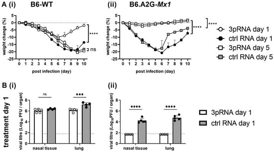 Studies to date investigating 3pRNA-mediated protection of mice against IAV infection have utilised the intravenous (i.v.) route of administration [8,9,10,11]. Moreover, i.v. and intraperitoneal injections were used to demonstrate 3pRNA-mediated protection against SARS-CoV-2 [12,13] and CHIKV [7], respectively. Given that IAV is a respiratory virus, our initial studies in mice compared the effectiveness of a single intranasal (i.n). versus i.v. treatment in providing protection against subsequent IAV infection. In preliminary studies, we confirmed that a single i.v. injection (12.5 μg in 200 μL) or i.n. inoculation (12.5 μg in 50 μL) of 3pRNA or ctrl RNA alone did not induce significant weight loss in B6-WT mice (data not shown).