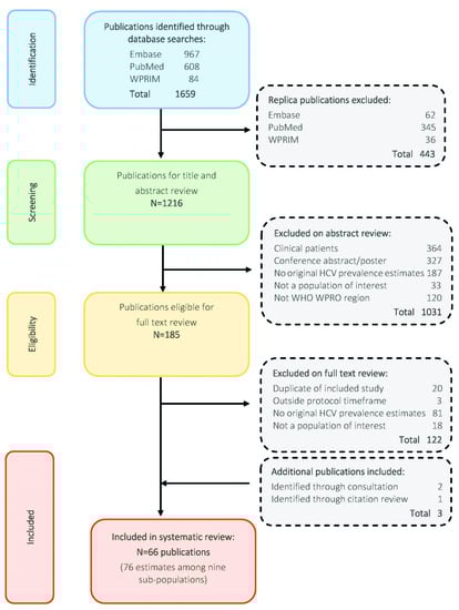 Publications were screened according to the following inclusion criteria: the study was conducted in one of the 37 WHO WPR countries or territories; reported serological or molecular HCV prevalence for a population of interest; included data on the number or frequency of individuals exposed to HCV at a specific time or time-period; data were collected in 2010 or later, and published between 1 January 2016 and 31 December 2020; and the study was conducted in humans. Populations of interest were: (a) the general population, defined as people living in a defined geographic area, excluding children aged < 18 years and high-risk groups; (b) non-remunerated blood donors: (c) pregnant women; (d) people who currently inject or previously injected illicit drugs; (e) men who have sex with men; (f) sex workers, defined as female, male, and transgender adults, over the age of 18, who receive money or goods in exchange for sexual services, either regularly or occasionally, and who may or may not self-identify as sex workers [7]; (g) prisoners/detainees, defined as people detained in closed settings; (h) Indigenous people, defined as distinct ethnic groups with a culture that is associated with a specific geographic region; and (i) migrants, defined as internal or foreign-born migrants living in a WHO WPR country or territory.