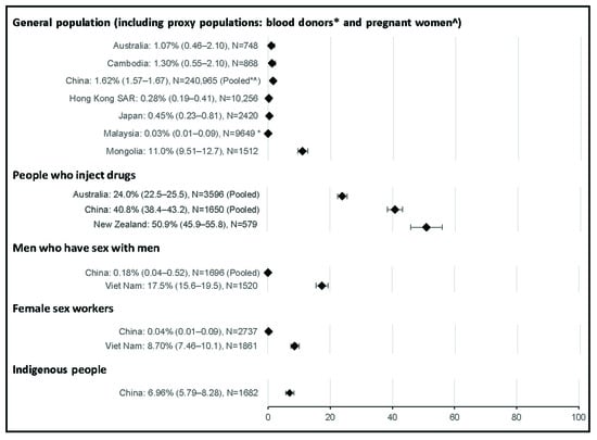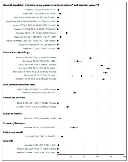 Seventeen estimates for HCV antibody prevalence among people who inject drugs were obtained from seven countries and territories. The median aggregate quality score was 17.5 (range 15–22) and no studies were assessed as poor-quality. HCV antibody prevalence among people who inject drugs ranged from 30% in Cambodia to 76% in the Hong Kong SAR. Seven estimates for HCV RNA prevalence among people who inject drugs were identified from three countries, ranging from 24% in Australia to 51% in New Zealand.