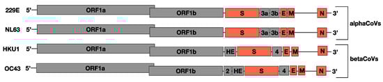 The four sHCoV species are part of two CoV genera, alphacoronavirus (alphaCoV, 229E, and NL63) and betacoronavirus (betaCoV, HKU1, and OC43) [16]. The sHCoVs are enveloped, non-segmented, positive-sense RNA viruses with genome sizes of 27–30 kb [17]. CoV genomes are quite diverse, in part due to a high frequency of RNA recombination [18,19]. About two-thirds of the genome comprises the open reading frame 1a/b (ORF1a/b) encoding two replicase polyproteins, with the remaining one-third consisting of ORFs encoding the structural proteins hemagglutinin-esterase (HE: 1.2–1.3 Kbp, in HKU1 and OC43 only), spike (S: 3.5–4.7 Kbp), envelope (E: 0.2 Kbp), membrane (M: 0.6–0.7 Kbp), and nucleocapsid (N: 1.1–1.3 Kbp), as well as several accessory proteins (Figure 1) [20]. The spike protein responsible for the characteristic crown-like appearance of these viruses under electron microscopy has utility in receptor binding and viral entry and is also the most variable at the nucleotide and amino acid levels of the coronaviruses’ ORFs [21]. The envelope and membrane proteins have a role in the CoV assembly and determining the shape of the viral envelope while the nucleocapsid protein has a protective role through the packaging of the viral genomic RNA into ribonucleoprotein complexes called nucleocapsids, ensuring timely replication and reliable transmission [22]. These four structural proteins are crucial for virus entry into host cells and subsequent replication.