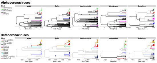Maximum clade credibility (MCC) trees inferred from dataset D5 for full genomes (WGS), and the spike, nucleocapsid, membrane, and envelope ORFs, with the branches color-coded by the inferred coronavirus host. The upper panel shows MCC trees from alphacoronaviruses while the lower panel shows MCC trees from betacoronaviruses. Human, camel, and porcine coronavirus clades have been collapsed to increase readability. Human * is a lone human CoV (FJ415324) that clusters with ungulate and canine CoVs. Individual and more detailed MCC trees can be found in File S2.