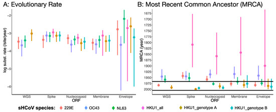 While the dates on which the sHCoVs were first isolated are well known [29,31,33,74], we were interested in estimating their MRCAs (Figure 3B and Figure S3). The median MRCA of the HKU1 viruses (HKU1_all) for the WGS, spike, nucleocapsid, and envelope was dated between 1809 and 1899 with wide 95% HPDs and was much older than the median MRCAs of the other sHCoVs (median: 1934–1983). However, HKU1 genotypes A and B had their median MRCAs dated much more recently, between 1975 and 1999, with overlapping 95% HPDs and we could not determine which of the two HKU1 genotypes might have emerged first. It is only for the spike ORF that the median MRCAs for the 229E, OC43, and NL63 appeared to follow the sequence of their respective first isolation dates. While the spike had the earliest median age of the MRCAs for 229E, NL63, and HKU1, this ORF had the youngest median MRCA ages for OC43 and HKU1 genotypes A and B. The estimated much earlier dating of HKU1 was not expected given these CoVs are the most recently isolated of the sHCoVs [33] and raises questions about whether this could be a consequence of under sampling and/or dating of two very distinct variants (genotypes A and B) that were independently transmitted into the human host.