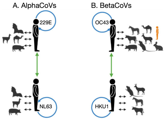 Coronaviruses predominantly circulate among non-human hosts, with rare cross-species transmission to humans through handling of infected wild and domestic animals [23,24,25]. Until 2003, and prior to the identification of the severe acute respiratory syndrome coronavirus 1 (SARS-CoV-1) [26,27] as the causative agent of the SARS pandemic of 2002–2003 [28], only 229E and OC43, isolated nearly 60 years ago [29,30,31], were known to infect humans. Not long after the identification of SARS-CoV-1, NL63 and HKU1 were identified in 2004 and 2005, respectively [32,33]. It is thought that all sHCoVs originate from bat CoVs, with some transmitted directly to humans (NL63) and others indirectly transmitted through intermediate hosts (229E, HKU1, and OC43) [34,35,36]. The presumptive ancestor of the OC43 is the bovine CoV, with which it has been estimated to share ~97% genome identity [37,38], while 229E is thought to have emerged from a camelid CoV and shares ~91–93% genome identity [39,40,41]. Lastly, HKU1 is thought to have emerged from a murine CoV [42]. Understanding the zoonotic origins of sHCoVs not only aids in directing surveillance efforts for the future potential emergence of CoVs but also highlights cultural practices at the human and non-human interface that can help in designing prevention and treatment strategies.