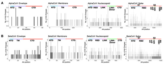 Amino acid (AA) ancestral reconstruction revealed that 29–57%, 29–35%, 16–26%, and 19–48% of the AA alignment positions of the spike, nucleocapsid, membrane, and envelope, respectively, had at least one AA substitution across the genealogy of the sHCoVs (File S4). In Figure 5 (and Figure S4), we show the number of the inferred AA changes associated with the sHCoVs in the envelope, membrane, nucleocapsid, and spike proteins. While AA changes were inferred to occur throughout the spike protein, an elevated number of changes occurred within the receptor binding domains (RBDs).
