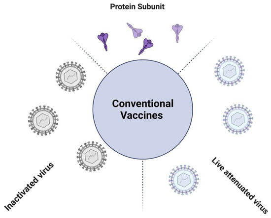 Vaccination is the most cost-effective strategy to control viral pathogenicity and transmission, thus counteracting infectious diseases. Vaccinations have saved and are currently saving millions of lives, having reduced the mortality rate in pediatric ages by 60% from 2000 to 2019 (from 9.92 to 5.30 million), although in 2019, vaccine-preventable deaths represented 22% of the under-5 deaths worldwide [9]. Conventional vaccines are often based on: (i) attenuated viruses, (ii) killed pathogens (inactivated), and/or (iii) subunits of protein antigens, which will then elicit specific immune responses (Figure 1).