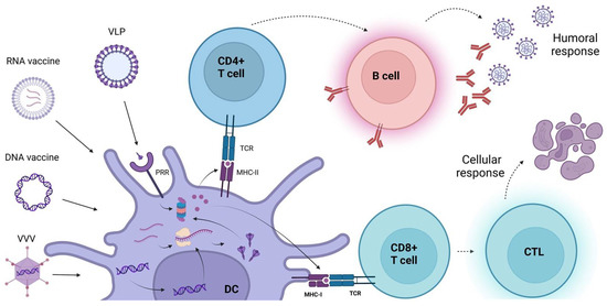 VVVs themselves, resembling the characteristics of viruses, promote a high immune response. After delivery, VVVs target DCs and macrophages and are sensed by PRRs, such as TLR9 recognizing dsDNA, inducing a type I interferon response. After being delivered to the DCs, VVVs are then drained by the lymph nodes and are presented to the T cell, priming both antigenic and inflammatory signals and leading to inflammatory cytokine production. Therefore, VVVs activate both the CD4+ and CD8+ T cells, leading to the activation of antibody-secreting B cells and CTL response. The production of interferons and pro-inflammatory molecules further boosters the immune response, promoting the generation of long-term immunological memory [67,107].