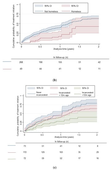 In the Kaplan Meier estimates, among all those diagnosed with current HCV infection, the cumulative probabilities of HCV treatment initiation were 15% (95% CI: 12%–20%), 27% (95% CI: 22%–32%), 38% (95% CI: 33%–44%), and 62% (95% CI: 55%–69%) at 3-, 6-, 12-, and 24-months following testing, respectively (Figure 1, Supplementary Table S2). Cumulative probability of treatment initiation by 24 months post-enrolment was lower in people with a history of incarceration (vs. no history of incarceration) and people who were homeless (vs. not) (Figure 1, Supplementary Table S2).