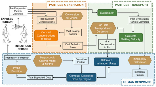The model framework presented in this paper is designed to be used to analyze a respiratory disease pathway from particle generation through the transport and dispersion of the particles, ending with inhalation and infectivity. The workflow of this framework is summarized in Figure 1. Note that the figure uses the terms “Particle Generation” and “Particle Transport”. Many authors use the term “aerosol” to describe small particles, typically below five microns in diameter, and “droplet” for larger diameters that tend to settle more quickly; this difference in terminology, and the need to develop a single term for what has typically been classified as aerosols and droplets, has been discussed in the literature [26]; this paper does not distinguish between the two particle size groups as the authors are presenting a generalized framework using algorithms that account for the full range of sizes: a lower bound that is typically dictated by the size of a single infectious agent and an upper bound that is dictated by the limits of respiration (i.e., respirable and inhalable particle size). Throughout this paper, we use “particle” as the single term to describe emissions from the respiratory tract, regardless of size or emission mode.