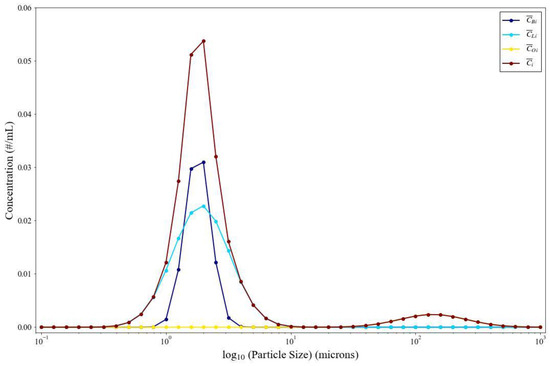 To determine the exposure particle concentration and size distribution required for an inhalability calculation, we consider a particle transport model. Concentration in the air is dependent on humidity, temperature, sunlight, particle composition, and the initial virus-laden particle emission rate [43]; these factors affect the number of particles present in a volume of air, the size of those particles, and the number of live virions in those particles.