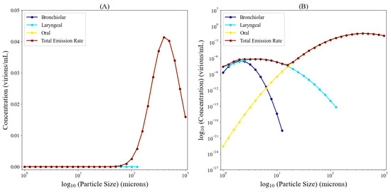Figure 3 is calculated from data from Figure 2 and demonstrates the particle concentration contributions from the bronchiolar ( dark blue), laryngeal ( light blue), and oral ( yellow) regions during coughing as well as the total particle concentration ( brown). Most particles generated via the respiratory tract are below ten microns (µm) (from the bronchiolar and laryngeal regions) with a non-negligible concentration above 20 µm from the oral region. The larger particles from the oral region are expected to settle rapidly, however particles in the 20 µm range can remain suspended in the air at a low concentration. Figure 4 shows the viral emission rates, further extrapolated from Figure 3. Since the larger particle sizes carry orders of magnitude more virus than the lower particle sizes, we are showing this in linear-log space (A) and log-log space (B). Low viral emission rates occur predominantly for particle sizes smaller than 0.5 µm, suggesting that they are unlikely to contain an infectious virus. Meanwhile, the majority of expelled virus takes place for particle sizes over ten microns, where we see an order of magnitude increase in viral concentration of particles every 20 microns.