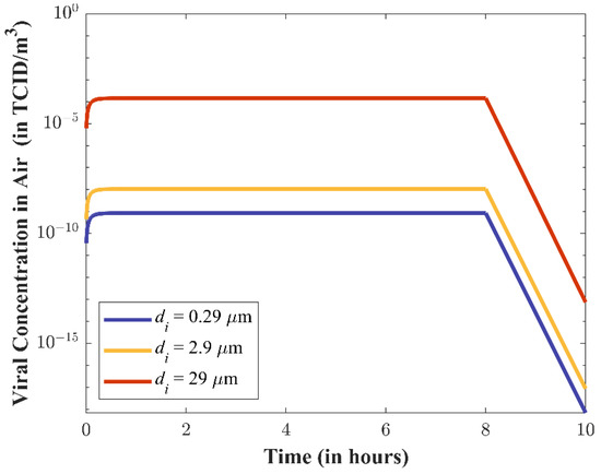 Particle Transport. Figure 5 presents the calculated viral concentration in the air as a function of time () for different particle diameters of increasing size (0.29 µm, 2.9 µm, and 29 µm). Viral concentration increases as particle size increases, which is a byproduct of this same relationship being present in the viral emission rates (see Figure 4). The larger particles will settle faster. The viral concentration of the remaining larger particles, however, will remain several orders of magnitudes higher than the smaller particles.