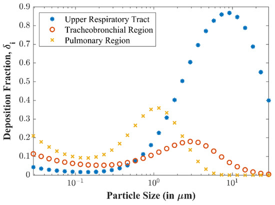 Figure 7 plots the deposition fractions (including inhalability) at the upper respiratory tract, tracheobronchial region, and pulmonary region versus particle size, calculated by the human response submodel. Observe that larger particles are unlikely to be deposited in the tracheobronchial and pulmonary airways and will instead be filtered out by the upper respiratory tract. As demonstrated above, a decrease in inhalability results in a decrease of overall deposition for larger particles.