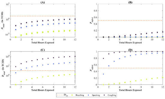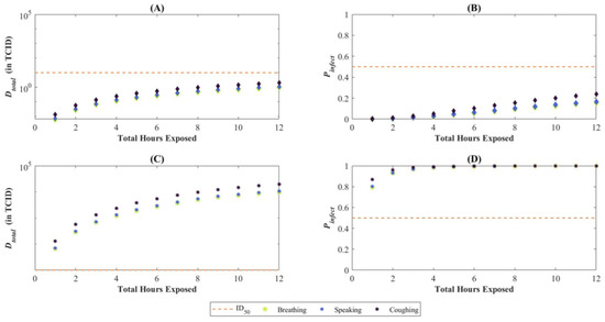 Total deposited dose () and probability of infection () for varying continuous exposure periods. The orange dashed line in each subplot represents the ID50 or 50% chance infection. Subplots (A,B) correspond to the median values, whereas (C,D) to the 95th percentile. In our baseline scenario, this is only met for the 95th percentile of (or ) and if coughing or speaking is the particle emission mechanism into the environment by the infectious person.