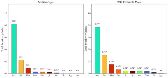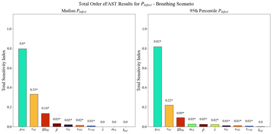Total sensitivity indices (ordered from largest to smallest) derived using eFAST for the median and 95th percentile of with breathing as the emission mechanism. Asterisks (*) indicate statistically significant sensitivity indices (α = 0.01).