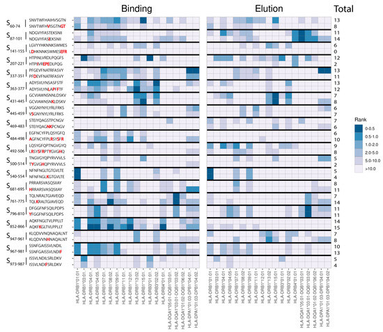 NetMHCIIpan-4.0 (accessed: 13 December 2021) [33] was used to predict the binding affinity as well as the likelihood to be naturally presented via the selected 19 different HLA-II alleles. As input, all possible 15-mer peptides spanning the whole spike protein sequence of D614G WT reference strain (UniProtKB: P0DTC2) were used. For this purpose, both the % rank score of the binding affinity prediction (BA data) and the % rank score for likelihood of a peptide to be naturally presented (EL data) for each of the selected HLA-II alleles were considered. The % rank scores normalizes prediction score by comparing to prediction of a set of 100,000 random natural peptides [33]. Criteria for peptide selection were: % rank score < 2.00 for BA or EL data of at least one HLA-II allele, and % rank score of BA or EL data between 2.01 and 10.00 for at least 5 different HLA-II alleles.