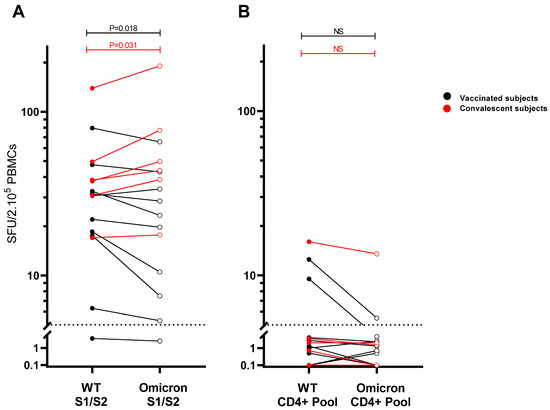 Ex vivo T-cell responses against Omicron BA.1 whole spike protein are relatively preserved in most prior-vaccinated and convalescent individuals. The SARS-CoV-2-specific IFN-ɣ+ T-cell response was measured by ELISPOT assay. PBMCs of vaccinated (n = 10; black dots/lines) and convalescent individuals (n = 6; red dots/lines) were directly stimulated with (A) a pool of overlapping peptides for the entire spike protein (S1 + S2) corresponding to the D614G wild-type (WT) strain versus the Omicron BA.1 variant or with (B) a pool of selected CD4+ T-cell epitope candidates from WT strain versus the corresponding sequences of the Omicron BA.1 variant. Each pair of dots connected with line represents SARS-CoV-2-specific IFN-ɣ+ T-cell response of one subject responding to WT (closed dots) versus Omicron BA.1 peptides (open dots). Dotted line indicates threshold for IFN-ɣ-positive responses. Pairwise comparison of T-cell responses to WT and Omicron BA.1 peptide pools assessed by Wilcoxon signed-rank T test revealed a significant difference in response in vaccinees (reduction in response to overlapping S1/S2 Omicron peptide pool; p = 0.018) and convalescent subjects (increased response to S1/S2 Omicron peptide pool; p = 0.031). SFU—spot forming units.