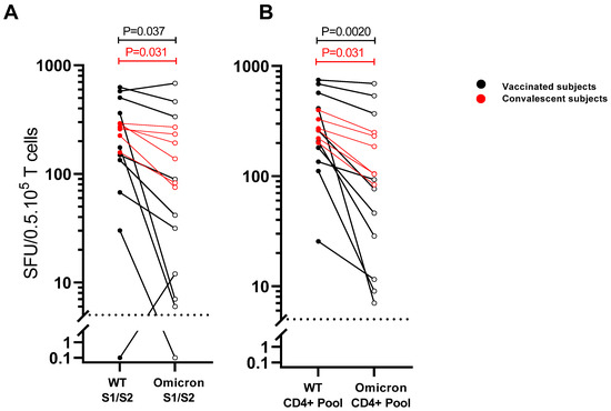 Subsequently, we performed an ELISPOT to enumerate spike-specific IFN-ɣ+-producing cells in the peripheral blood of vaccinated or convalescent individuals. For this purpose, PBMCs were stimulated either with pools of overlapping peptides (15-mers, with 11 overlap) covering the whole spike protein (S1/S2) of the D614G WT SARS-CoV-2 strain (“WT S1/S2”) or the whole Omicron BA.1 variant spike protein (“Omicron S1/S2”), or with the respective “WT CD4+ pool” or “Omicron CD4+ pool”. In the 10 vaccinated subjects (23–39 years), sampled 28 days post-primary COVID-19 mRNA vaccination and with no evidence of previous SARS-CoV-2 infection, frequencies of IFN-ɣ+ T cells reactive to the “Omicron S1/S2 pool” were slightly reduced compared with the “WT S1/S2 pool” (respectively, 22 median spot-forming units (SFU)/2.105 PBMCs) versus 26 SFU/2.105 PBMCs; p = 0.018). In the 6 convalescent subjects (18–51 years), samples collected at 6–8 weeks post symptom onset after infection with ancestral SARS-CoV-2 (March–May 2020), frequencies of IFN-ɣ+ T cells reactive to “WT S1/S2 pool” were in a similar magnitude as vaccinated individuals. However, frequencies of IFN-ɣ+ T cells reactive to “Omicron S1/S2 pool” were significantly lower in PBMCs of vaccinees than in PBMCs of convalescent subjects (p = 0.031; median SFU/2.105 resp. 22 versus 47).