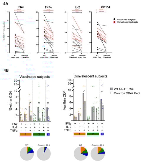 For more in-depth functional characterization of the WT versus Omicron-spike-specific T-cell populations, propagated T-cell lines of all subjects were restimulated with either the “WT CD4+ pool” or the “Omicron CD4+ pool” and analyzed by flow cytometry. In the T-cell lines of the vaccinees, high frequencies of SARS-CoV-2-specific CD4+ T cells producing IFN-ɣ, TNF-α, and/or IL-2 were measured by intracellular cytokine staining (ICS) after stimulation with the “WT CD4+ pool”. In line with the IFN-ɣ ELISPOT results, percentages of cytokine positive cells were significantly lower upon restimulation of the T-cell lines with the “Omicron CD4+ pool” (median 11% versus 2.9% IFN-ɣ+ of the CD4+ T-cell population (p = 0.0059); 19% versus 5.5% TNF-α+ (p = 0.039) and 11% versus 3.8% IL-2+ (p = 0.020)) (Figure 4A). In convalescent subjects, a similar pattern was observed; cytokine production was reduced in “WT CD4+ pool” versus “Omicron CD4+ pool” restimulated T-cell lines (17% versus 13% IFN-ɣ+ (p = 0.031); 27% versus 19% TNF- α+ (p = 0.031)); 15% versus 12% IL-2+ (p = 0.031) (Figure 4A). The frequencies of TNF-α+ and CD154+ CD4+ T cells responding to “Omicron CD4+ pool” was significantly lower in T-cell lines obtained from vaccinees compared with convalescent subjects (TNF-α: median of, respectively, 5.3% versus 19% positive cells, p = 0.042; CD154: 13% versus 24%, p = 0.042). Moreover, the decrease in response from the “WT CD4+ pool” to the “Omicron CD4+ pool” was more prominent in vaccinees than in convalescent subjects (0.40- versus 0.72-fold change in percentage of IFN-ɣ+/CD4+ T cells, p = 0.056; 0.41- versus 0.77-fold change in percentage of TNF-α+/CD4+ T cells, p = 0.056; 0.39- versus 0.67-fold change in percentage of IL-2+/CD4+ T cells, p = 0.073; 0.41- versus 0.70-fold change in percentage of CD154+/CD4+ T cells, p = 0.042).