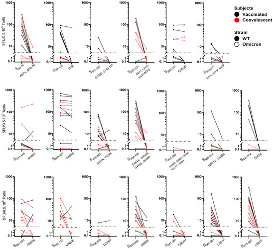 Functional impact of Omicron BA.1 mutations on individual spike-epitope-specific T cells of vaccinated and convalescent subjects. Recognition of individual CD4+ T-cell epitopes of spike protein by polyclonal-epitope-specific T-cell lines in IFN-ɣ ELISPOT assay. T-cell lines were generated by 14-day in vitro stimulation of PBMCs from vaccinated (black dots/lines) and convalescent individuals (red dots/lines) with a pool of selected CD4+ T-cell epitope candidates from the D614G wild-type (WT) strain (“WT CD4+ pool”) in the presence of IL-2. Subsequently, cells were stimulated for 24 h with 20 individual CD4+ T-cell epitopes of spike protein of WT strain versus corresponding sequences of the Omicron BA.1 variant. Each pair of dots connected with line represents SARS-CoV-2-specific IFN-ɣ+ T-cell response of one subject responding to an individual WT (closed dots) versus Omicron BA.1 peptide (open dots). On the Y-axis each individual peptide pair is indicated as location of first and last amino acid position within WT spike protein (S), whereas the corresponding Omicron BA.1 sequence is indicated by the location(s) of the amino acid residue(s) that changed compared with the WT sequence. Dotted line indicates threshold for IFN-ɣ-positive responses. SFU—spot forming units.