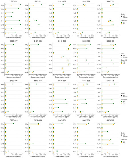 Reduced cytokine responses to the individual spike epitopes harboring Omicron BA.1 mutations. T-cell lines were generated by 14-day in vitro stimulation of PBMCs with a pool of selected CD4+ T-cell epitope candidates from the D614G wild-type (WT) strain (“WT CD4+ pool”) in the presence of IL-2. T-cell lines from two vaccinees, i.e., donor #V3 (orange) and donor #V4 (dark green), were analyzed for secretion of various cytokines detected using a flowcytometric assay. Lollipop plots show concentrations of different cytokines measured in T-cell line supernatants after stimulation of T cells with individual peptides of spike protein of D614G wild-type (WT) strain (closed dots) and corresponding Omicron BA.1 variant peptides (open dots). Differences between the response to an individual WT and a corresponding Omicron peptide are presented by a connecting line. Above each plot, the location of first and last amino acid position within WT spike protein (S) of the peptide used for stimulation are presented. Clearly reduced cytokine responses to the spike epitopes harboring Omicron mutations compared with the WT strain were observed for the following epitopes: S60–74, S469–483, S484–498, S540–554, S761–775, S967–981, and S973–987.