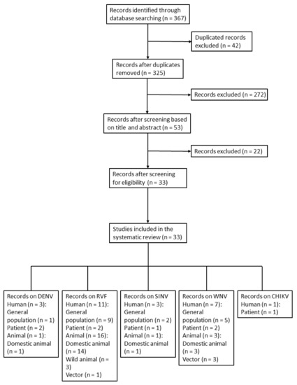 The selection process, based on PRISMA guidelines, is shown in Figure 1 [32]. The search yielded 367 reports, 325 of which were initially screened after the removal of duplicates. Following the screening process, 33 of the 325 studies, covering RVFV, DENV, WNV, SINV, and CHIKV, were eligible for inclusion in the study (Table 1, Figure 1). Sixteen of the 33 studies involved human samples. Nineteen, two, and three studies were performed on domestic animals (camels, sheep, cattle, buffalo, goats, pigs, horses, and donkeys), wild animals (mice, rats, and birds), and vectors (mosquitoes and ticks), respectively. General information on geographic distribution, host, vector, and known genotype of MBVs that have been historically recorded in Egypt is provided in Table 1.