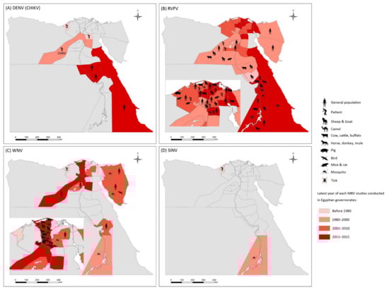 Epidemiology of mosquito-borne viruses reported among vector, animal, and human populations in Egypt. (A) dengue virus (DENV) and Chikungunya virus (CHIKV); (B) Rift Valley fever virus (RVFV); (C) West Nile virus (WNV); (D) Sindbis virus (SINV).
