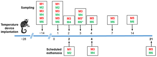 Schedule of in-life and post-mortem sampling. Animals (red—female; green—male) were surgically implanted with a Remo 201 device (EMMS, Bordon, UK) and allowed 4 weeks to recover prior to challenge with SARS-CoV-2. Baseline blood samples were collected 2 weeks prior to challenge. On days 1, 2, 3, 4, 7, 14, and 21 post-challenge, groups of animals were anaesthetized and blood, throat, and nasal swabs were collected to assess viremia, immunological parameters, and virus shedding (* note that blood samples were not collected from M5 and M6 on day 3 post-challenge). Pairs of marmosets were euthanised at day 2, 4, and at the end of the study on day 21 post-challenge and blood and tissues were collected at post mortem for further analyses.