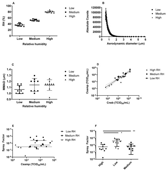 Optimization of the aerosolization of SARS-CoV-2. (A) The relative humidity conditions explored; (B) Particle size distribution at different relative humidities; (C) Mass median aerodynamic diameter (MMAD) at each relative humidity; (D) Comparison of nebuliser (Cneb) and impinger (Csamp) concentrations at low, medium, and high relative humidity. Individual data points are presented with calculated linear regression line and the 95% confidence interval; (E) Comparison of the Spray Factor and impinger (Csamp) concentration at low, medium, and high relative humidity. Individual data points are presented with calculated linear regression line for each relative humidity subgroup; (F) Comparison of the Spray Factor at low, medium, and high relative humidity. Data is presented as the mean and SD where * p = 0.0266 and ** p = 0.0022.