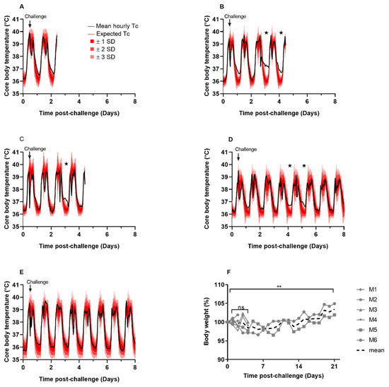 Clinical observations in marmosets challenged with SARS-CoV-2 by the aerosol route. Remote telemetry was used to monitor core body temperature (Tc) in marmosets. Normal diurnal temperature ranges between 38–39 °C during the day and 36–37 °C at night. The mean hourly temperature (black line), the expected temperature (using baseline data for each individual animal; dark red line), and the expected temperature ±1 SD (bright red shaded area), ±2 SD (red shaded area), and ±3 SD (pink shaded area) are shown for (A) M1, (B) M3, (C) M4, (D) M5, and (E) M6 from days 0 to 8 post-challenge. ★ Indicates Tc > 3 SD than the expected Tc (note that there is no Tc data for M2 due to failure of implant). (F) Animals were weighed prior to the challenge to determine baseline weights and daily throughout the study. Data is presented as the percentage body weight change for each animal, or the mean of all animals. A mixed-effects model was used to determine statistical difference in weight change with time where ns—not significant and ** p = 0.007.