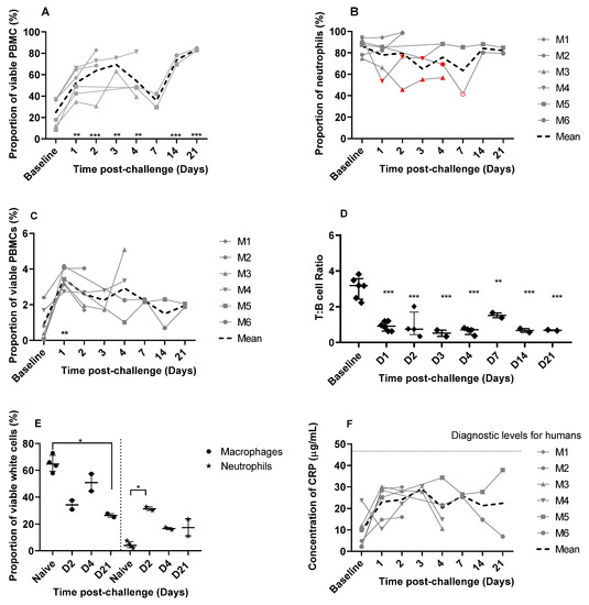 The immunological response in marmosets following aerosol challenge with SARS-CoV-2 VIC01. (A) The proportion of neutrophils in PBMCs from blood collected prior to, and post-challenge defined by size, granularity, and expression of both CD11c and CD14. (B) HLA-DR expression in circulating neutrophils in marmosets following SARS-CoV-2 challenge. Filled red symbols denote a reduction in HLA-DR expression (defined as 10% below baseline for each individual animal determined from pre-challenge samples); pink open circle denotes a poorly stained sample on day 7 for animal M6 and this data therefore should be treated with caution. (C) The proportion of monocytes in PBMCs from blood collected prior to and post-challenge. The T:B cell ratio (D) in PBMCs from blood collected prior to challenge and on days 1, 2, 3, 4, 7, 14, and 21 post-challenge were defined by size, granularity, and expression of CD3+:CD20+. (E) Proportion of macrophages and neutrophils in marmoset lung following SARS-CoV-2 challenge (n = 2 per time point). Samples from naïve animals (n = 4) were processed during the study to provide resting levels. (F) Quantification of CRP in marmoset plasma detected by ELISA in marmoset plasma samples. Data is presented for each animal. The COVID diagnostic level is the threshold of diagnostically significant levels of CRP described in human COVID-19 cases. In all figures, data is presented for each animal and the normal ranges were defined by the pre-challenge values. Statistically significant differences from pre-challenge values were determined by one-way ANOVA where * p < 0.05, ** p < 0.01 and *** p < 0.001.