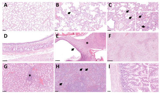 Sections of lung, nasal cavity (longitudinal section close to the medial septum after decalcification with 10% formic acid solution), trachea, liver, kidney, spleen, mediastinal lymph node, thymus, oesophagus, small, and large intestine from each animal were fixed in 10% neutral-buffered formalin (for 16 to 35 days), processed to paraffin wax and 4 µm thick sections cut and stained with haematoxylin and eosin (H&E). The tissues specified above were examined by light microscopy and evaluated subjectively by a qualified pathologist. Tissue sections were scanned by a Hamamatsu NanoZoomer S360 and viewed with NDP.view2 software (v2.8.24, Hamamatsu, Japan). The pathologist was blinded to the group details and the slides were randomized prior to examination in order to prevent bias (blind evaluation).