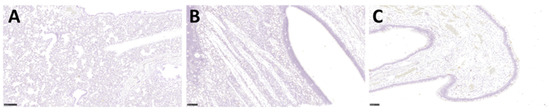 Representative images of ISH of respiratory tissues from animal M2 by RNAScope. Sections of lung (Bar = 250 µm) (A), nasal olfactory cavity (Bar = 100 µm) (B), and respiratory epithelium (Bar = 100 µm) (C) were stained for the presence of the SARS-CoV-2 S gene. No positive staining was detected within the lung, respiratory epithelium, olfactory epithelium, glands, or nerve terminations.